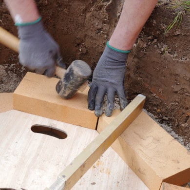 Die Feuerstelle wird in mehreren Etappen gemauert. Dabei werden die Schamottsteine in jeder Reihe an die Schablone angelegt. Im ersten Schritt platzieren Sie die erste Reihe Schamottsteine bündig an die Schablone an und kontrollieren die Ebenheit der Steine.Tragen Sie nun eine Schicht Feuerzement auf. Wir empfehlen eine Fugenstärke von 2 mm. Mischen Sie immer nur die Menge, die Sie für eine Steinreihe benötigen, da das Material schnell anzieht und die Bindefähigkeit verliert.