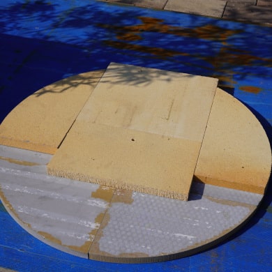 Richten Sie nun die Schamotteplatten passend auf den Kasi-Platten aus. Beachten Sie unbedingt die Lage der einzelnen Platten. Bitte beachten Sie, dass die Platten nur gelegt und nicht verklebt werden.