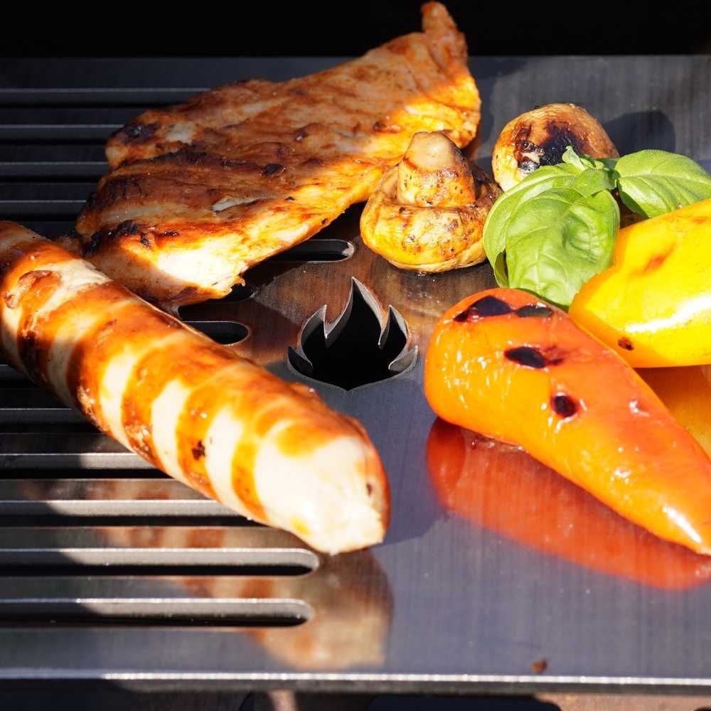 Diese Grillplatte mit integriertem Grillrost aus massivem Stahl bietet eine Grillfläche von 43,0 x 31,4 cm und ist 4 mm stark. Auf der Grillplatte lassen sich allerlei Gerichte zubereiten. Sie können auf dem integrierten Rost Steaks und Würstchen grillen und gleichzeitig, auf der Platte, z. B. Pfannkuchen oder Rühreier zubereiten. Ihrer Kreativität sind keine Grenzen gesetzt. Sie ist universal einsetzbar und passt auf die meisten Grills. Messen Sie vorab die Größe der Grillfläche ab.