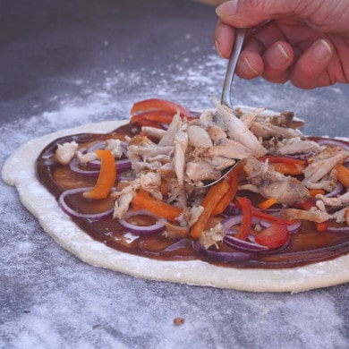 Geben Sie BBQ Sauce auf den Teig und verteilen Sie diese