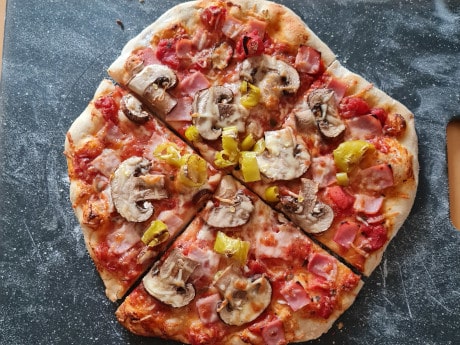 Nun konnte die fertig belegte Pizza auf den Stein mittels Pizzaschieber gelegt werden. Der mittlere Brenner wurde für die eigentliche Backzeit ausgeschaltet, um ein Verbrennen des Pizzabodens durch überhöhte Hitze zu verhindern. Die Backzeit unterschied sich von der ersten (etwa acht Minuten) zur zweiten Pizza (etwa vier Minuten), da die Temperatur unter dem Pizzaaufsatz sich nochmals deutlich erhöht hatte. Während der Backdauer drehten wir die Pizza zwei bis drei Mal, um ein gleichmäßiges Backergebnis zu erhalten. Nach den jeweiligen Zeiten konnten die Pizzen herausgenommen werden. Der Belag hatte eine schöne Farbe, der Käse war quasi perfekt verlaufen. Der Rand schlug schöne Blasen, wie wir es so nur von Pizza beim Italiener kennen. Auch der Boden hatte eine schöne Farbe: weder zu hell noch zu dunkel mit einer tollen Stabilität.